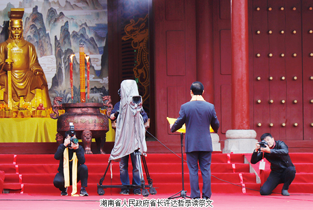 上午9时许,全场凝神肃立,气氛庄严,在悠扬的古乐下,主祭人向舜祖上香及各界嘉宾依次向舜帝敬献花篮 ; 全体参祭人员向舜帝深鞠三躬,虔诚致敬,深情缅怀舜帝的地德天功、浩瀚恩泽。主祭人许达哲恭读《祭舜帝文》,颂扬着舜帝丰功伟绩,表达三湘儿女弘扬舜帝精神,传承中华文明,凝心聚力,砥砺奋进,为实现“两个一百年”战略目标,弘扬中华优秀传统文化,建设富饶美丽幸福新湖南,谱写中华民族伟大复兴中国梦的湖南篇章而努力奋斗的雄心壮志。舜辉天下, 光照日月,读毕祭文,许达哲将祭文帛书置于香炉中焚化,告慰舜帝英灵。礼炮、古乐再次响起,祭典仪式圆满告成。