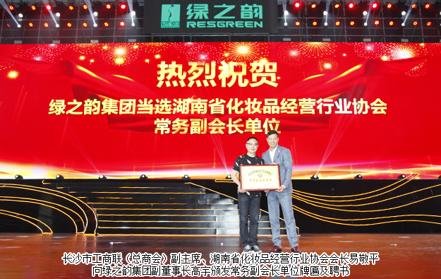 长沙市工商联(总商会)副主席、湖南省化妆品经营行业协会会长易敬平先生代表湖南省化妆品经营行业协会,向高董颁发常务副会长单位牌匾及聘书。