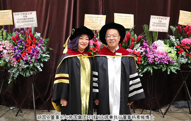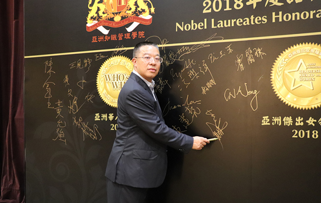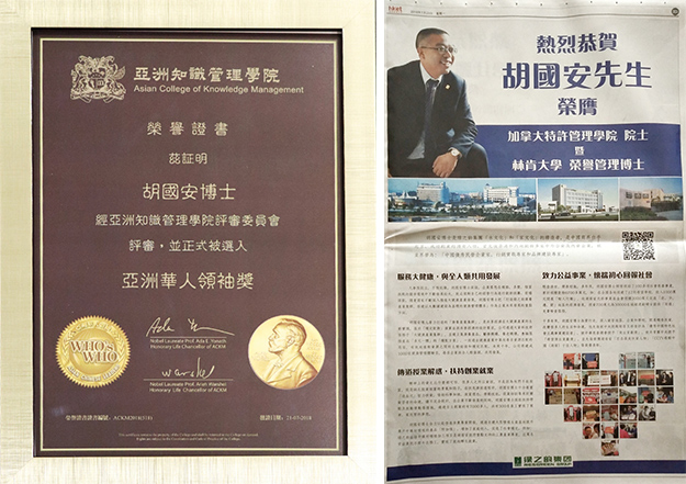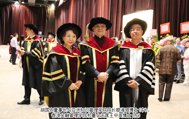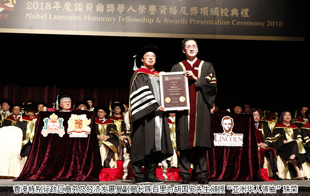 2018年7月21日,由亚洲知识管理学院举办的诺贝尔奖学人系列——2018年度资格及奖项颁授典礼,在香港亚洲国际展览馆隆重举行,香港特区政府官员、跨国企业家、商界领袖等全球各界重量级嘉宾云集现场,群星闪耀,共襄盛会。湖南省政协委员、湖南省工商联(总商会)副会长、香港湘都同乡会名誉会长、香港长沙商会常务副会长、mk网董事长、绿韵控股集团董事局主席胡国安先生荣膺“加拿大特许管理学院院士暨林肯大学荣誉管理博士”“亚洲华人领袖”殊荣,并出席颁授典礼。