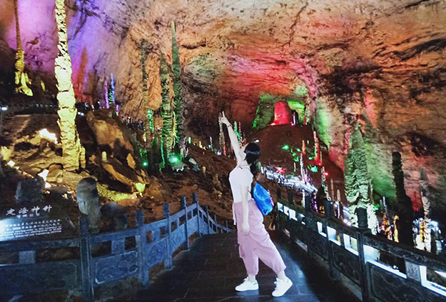 “世界溶洞奇观”黄龙洞规模之大、内容之全、景色之美,包含了溶洞学的所有内容。绿之韵家人感受庞大的立体结构洞穴空间、丰富的溶洞景观、水陆兼备的游览观光线路,洞内钟乳石种类繁多,洁白晶莹的钟乳石、石笋、石柱、石幔、石花、卷曲石、石珍珠、石珊瑚等玲珑剔透,游览天仙水瀑布、花果山、龙宫大厅、定海神针,每一根石笋都令绿之韵家人惊叹称奇。