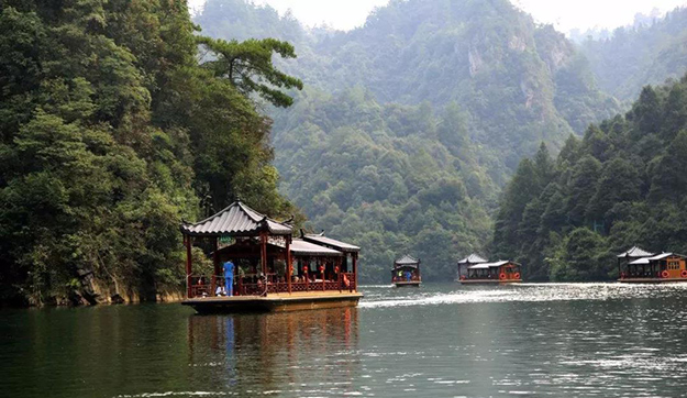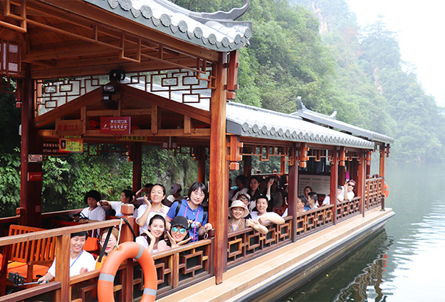 世界自然遗产——宝峰湖:被称为“世界湖泊经典”,属张家界地貌内自然山水与人文民俗相结合的湖泊型自然风景区。宝峰湖风景区集山水于一体,融民俗风情于一身,尤以奇秀的高峡平湖绝景、“飞流直下三千尺”的宝峰飞瀑、神秘的深山古寺闻名。乘船游览,欣赏仙女照镜、孔雀开屏、金蟾含月等景点,船在湖中游,绿之韵营销精英与土家阿哥、阿妹对唱山歌。