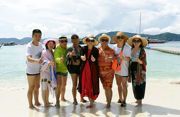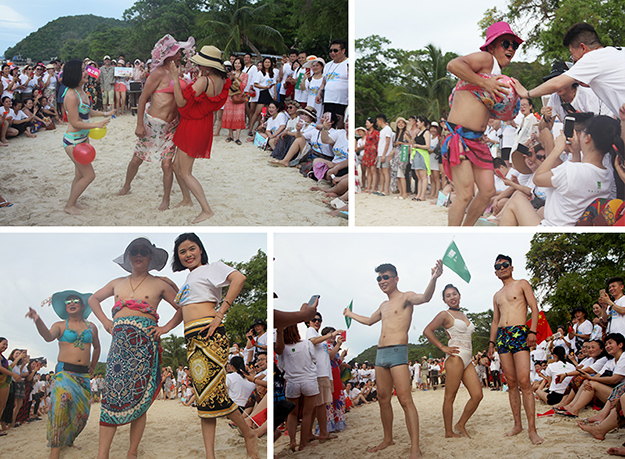 这个火辣辣的下午,家人们的欢声笑语回荡在整个珊瑚岛上空,热带、沙滩、落日、美丽的“水晶晶(泰语意为“美女”)”和帅气的“老妈妈”(泰语意为“帅哥”)们成为了岛上一道亮丽的风景线。