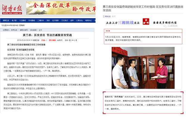 此次调研督查采取“四不两直”的方式进行。22日,中共湖南省委常委、省委统战部部长黄兰香一行先后来到安化县小淹镇百足社区村和田庄乡高马二溪村,查看扶贫台账,随机走访贫困户和非贫困户。在高马二溪村,了解到该村还有64户217人未脱贫。黄兰香叮嘱,一定要把这64户脱贫摘帽放在首位,一户一策,精准帮扶。23日上午,黄兰香一行又来到省委统战部扶贫点江南镇茅坪村开展调研,走访慰问贫困户,查看扶贫项目,并召开脱贫攻坚座谈会。督查组还分头对羊角塘镇睦鲤村等3个村的脱贫攻坚情况进行了走访督查,对反映群众身边问题的5个信访件办理情况进行核查,并在座谈会上通报情况。