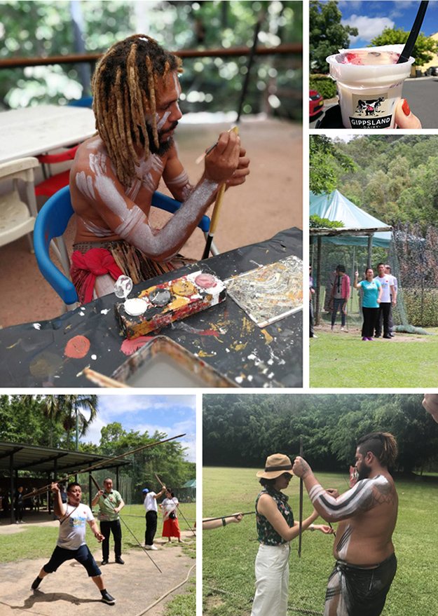凯恩斯的查普凯土著文化公园是澳洲最负盛名的景区之一,其最大的特色是有着40000年历史的查普凯土著文化。在这里,绿之韵家人们观赏了查普凯部落的传统表演,还了解了澳洲土著居民的传统文化与习俗。在公园里有一片开阔的草原,土著人在进行着飞去来标表演,绿之韵人也加入其中体验了一把投掷飞去来标的乐趣。