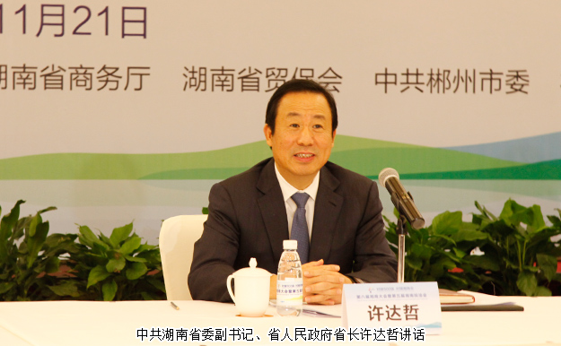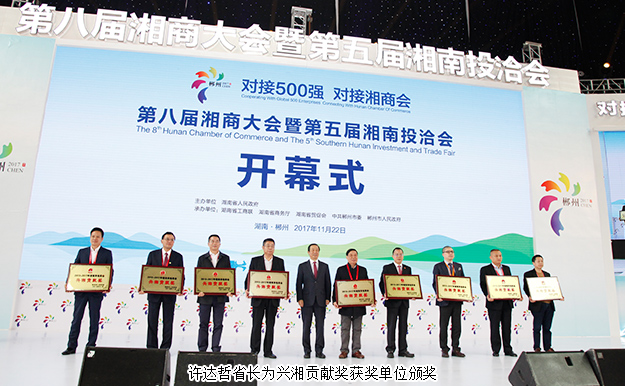 开幕式上,湖南省人民政府副省长何报翔作省情推介,中共湖南省委副书记、省人民政府省长许达哲出席开幕式并为兴湘贡献奖获奖单位颁奖。许达哲省长在讲话中表示,湖南自古以来英才辈出,有着深厚的文化和历史底蕴,广大的湘商传承着湖湘文化的精髓,涌现了一批又一批的商界精英。自2007年由省人民政府在长沙主办了首届湘商大会,10年来,湘商已成为湖南的一张独特的商业文化名片,湘商大会、湘南投洽会成为我省一年一度的重大经贸活动,也是我省扩大开放、加大招商引资、促进区域经济合作的重大平台,更是深入实施“创新引领、开放崛起”战略,加快推进“对接500强、提升产业链”及“对接湘商会、建设新家乡”等专项行动的重要举措。新时代新湘商,在日新月异的今天,湘商华丽转身,发展出“责任、创新、务实、和谐、诚信”的新湘商文化精神。湘商大会也成为了湖南每年一度的经济盛宴和重要的项目孵化器,是各地成功湘商紧密聚首、交流合作的一面精神旗帜。他希望,广大湘商能够在湖南这片投资热土上创业兴业,继续为家乡的建设发展献计献力,与湖南一起把握发展机遇,在推动湖南发展的同时,将企业做大、做强、做优,实现共赢发展;与家乡人民一道,共建富饶美丽幸福新湖南。