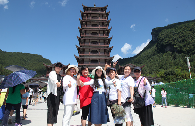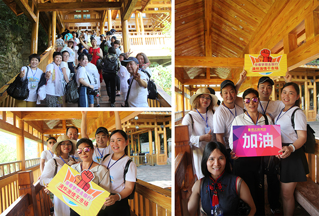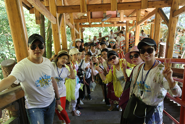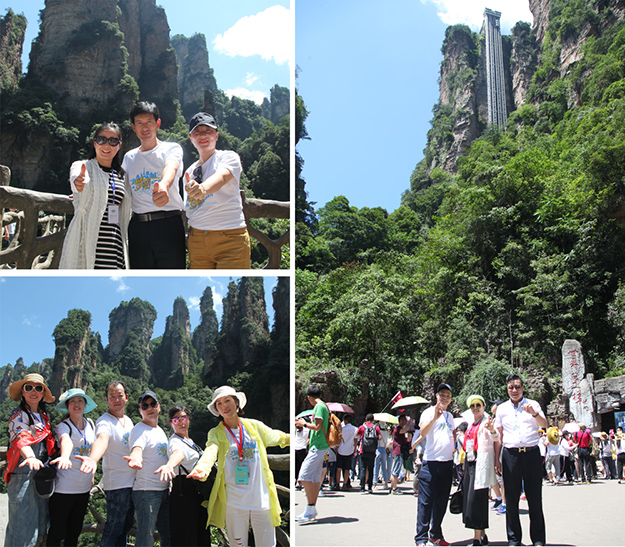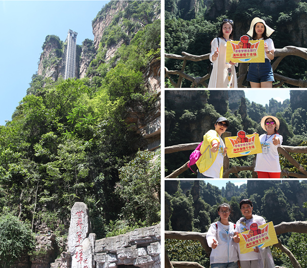 行程第三天,绿之韵家人们迎来了游览张家界国家森林公园的激情挑战。天子山是武陵源区四大风景之一,这里不但有奇山秀水,还有淳朴的民情、奇特的民俗和独具风味的民族食品。进入景区,绿之韵营销精英们统一乘坐“世界第一梯”百龙天梯上山。百龙天梯气势恢宏,因其“世界上最高、运行速度最快、载重量最大的电梯”而被载入吉尼斯世界纪录。家人们乘电梯以5米/秒的速度上山,慷慨科技进步的同时,惊叹于张家界的高山绝景和大自然的鬼斧神工。山上风景如画,绿之韵人游览其中乐趣无穷。从袁家界到十里画廊,营销精英们冒着烈日,拾级而上,相互鼓励,跨越过七千多级台阶,走完了全程。一路上,留下了绿之韵人的坚毅脚步和欢声笑语!