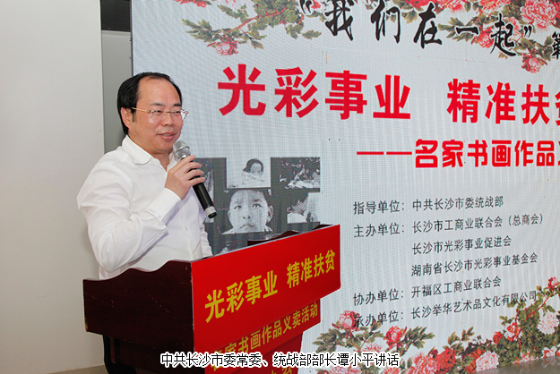 中共长沙市委常委、统战部部长谭小平对此次义卖活动给予了充分肯定,他在讲话中指出,要充分弘扬“致富思源、富而思进、扶危济困、共同富裕、义利兼顾、德行并重、发展企业、回馈社会”的光彩精神,并强调,企业家和艺术家要始终怀有“家国情怀、人文情怀、民生情怀”,自觉承担社会责任,关注社会,关注贫困人群,响应国家“共建精准扶贫”、实现“两个一百年”的奋斗目标,以实际行动投身到光彩事业中来,投身到精准扶贫、精准脱贫的攻坚战中来,奉献一片真情,贡献一份力量!