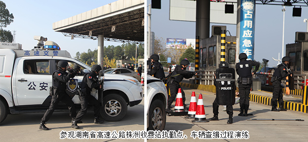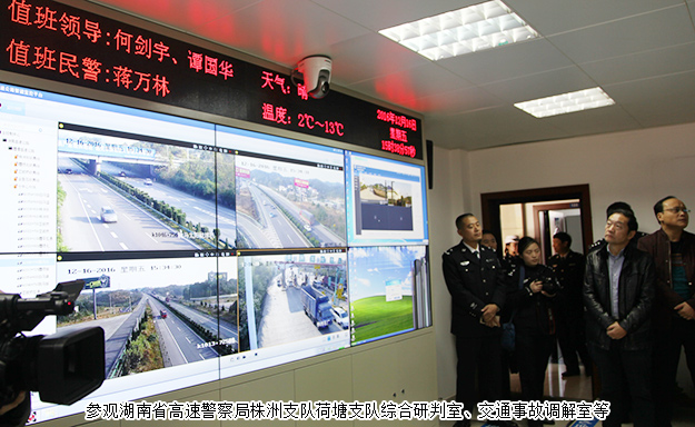 考察期间,湖南省公安厅特邀监督员胡国安等一行先后参观了湖南省高速公路株洲收费站执勤点,湖南省高速警察局株洲支队荷塘大队交通违法处罚室、交通事故调解室、综合研判室、执法办案区,详细听取了警用装备设施、警营文化建设等介绍,并与支队工作人员亲切交流。