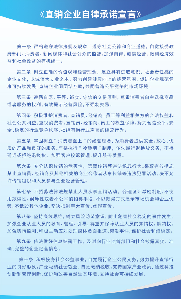 会上,中国本土59家直销企业代表共同签署了《直销企业自律承诺宣言》。