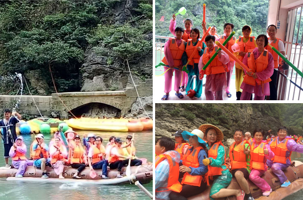第二站,绿之韵的家人们前往素有“天下第一漂”美誉的猛洞河漂流,感受与水搏斗的激情和清凉。水枪、水瓢、雨衣等打水仗的“武器”装备齐全,只见河中水花飞舞、水柱横飞,还未坐上船伙伴们就纷纷“湿身”了。拐一百五十五个弯,在一百三十三个滩潭中穿梭而行,途径三角岩、鸡笼门、落水坑瀑布、梦思峡……绿之韵家人顺流而下,在这里放歌长啸,戏水嘻闹,找回快乐的自我。