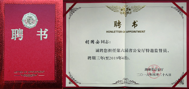 谈到再次受聘为湖南省公安厅特邀监督员,胡国安董事长表示: 2008年,我首次受聘为湖南省地方税务特邀监察员,2012年被受聘为湖南省纪委、省监察厅“机关效能建设和优化经济发展环境监督测评员”,2013年又被受聘为“湖南省公安厅第五届特邀监督员”,对特邀监督员这个身份始终葆有一种神圣的使命感和责任感。这个聘书是沉甸甸的,跟人大代表、政协委员的身份一样,不仅是一种光荣,更肩负着广大普通民众的瞩托。我一定不辜负省公安厅党委的期望,不辜负广大民众的重托,争做称职的、优秀的监督员,并充分发挥好监督、桥梁和参谋作用,为我省公安工作和队伍建设做出自己更大的贡献。