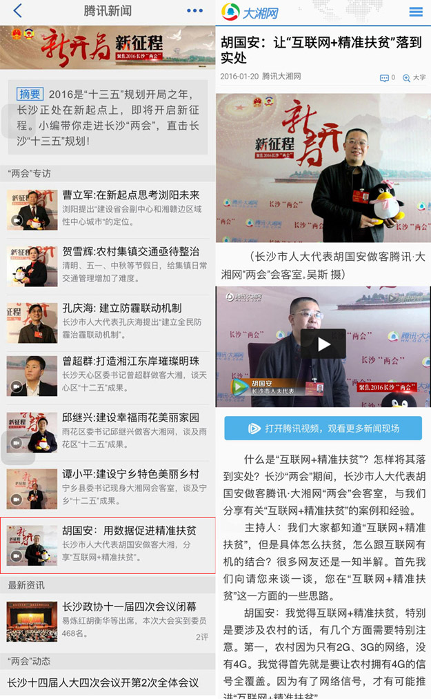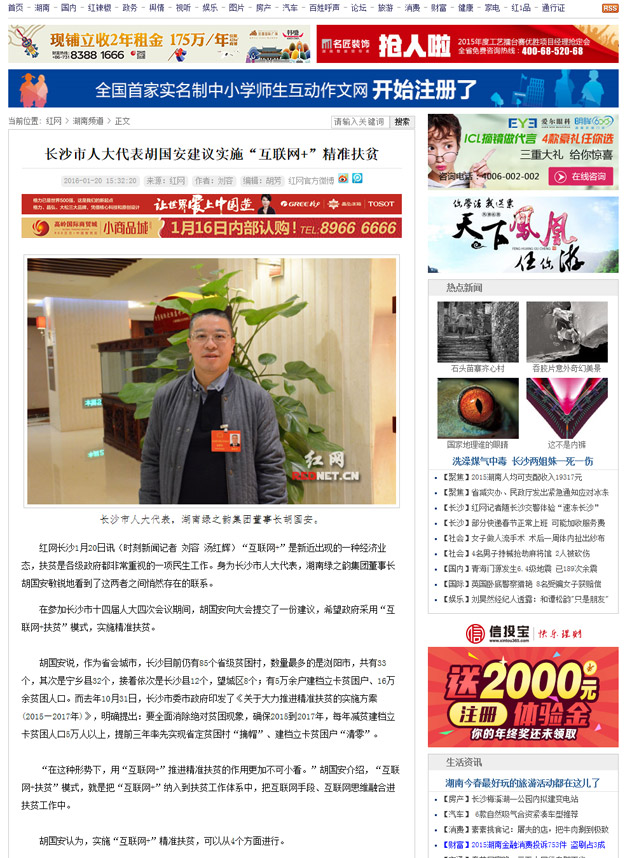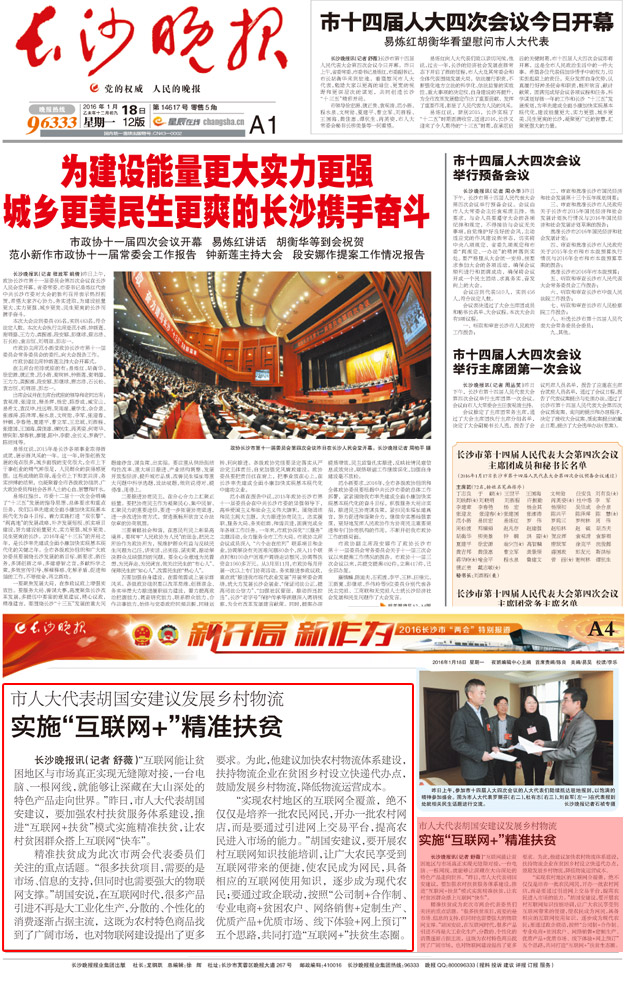 “今年的政府工作报告内容丰富充实,数据精准翔实,部分数字还精确到个位,说明政府对完成目标深有底气。今年,我所提交的人大议案《关于推进‘互联网+扶贫’模式实施精准扶贫的建议》和《关于大力发展乡村物流的几个建议》引起了与会代表和新闻媒体的广泛关注,令我感到十分振奋。互联网能让贫苦地区与市场真正实现无缝隙对接,能够让深藏在大山深处的特色产品走向世界。政府要积极推进互联网+扶贫模式实施精准扶贫,让农村贫苦群众搭上‘互联网+三农’的快车。我对目前mk网正在积极推进的电子商务战略规划激情满怀,信心百倍。绿之韵将紧紧依靠互联网、移动互联网‘两条腿’走路,构建‘以京津唐’和‘湖南益阳’为南北基点,以遍布全球的10000多家电子商务运营中心为网络的现代物流体系,打造国际一流的湖南本地电商企业,为长沙实现‘率先建成全面小康、加快实现基本现代化’的总目标不懈努力!”胡国安代表在接受腾讯网、长沙新闻频道、红网、长沙政法频道、长沙互动频道、长沙晚报、人大代表报、长沙市人民广播电台等多家媒体采访时,依然沉浸在政府工作报告的兴奋之中。