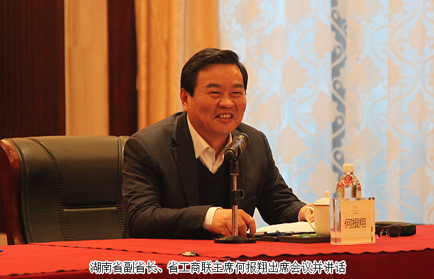 湖南省副省长、省工商联主席何报翔在会上指出,新常态下民营经济的生存发展危中有机,困难和机遇总是相伴而生,挑战之中有机遇,真正有远见、有胆识、有能力的企业家总是能在危机之中找到机遇,实现突破。他鼓励大家进一步提振发展信心,找准发展方向,增强发展活力,提高发展的质量和效益。进一步抓住机遇加快转型发展,在增强自主创新上加大研发投入,运用“互联网+”进行创新突破。进一步提升工商联服务水平,继续围绕民营企业发展开展调查研究,提出有针对性的对策建议,力争推动解决一批深层次问题,为民营经济的发展营造更好的氛围和更大的空间。