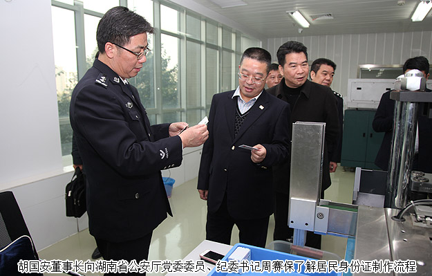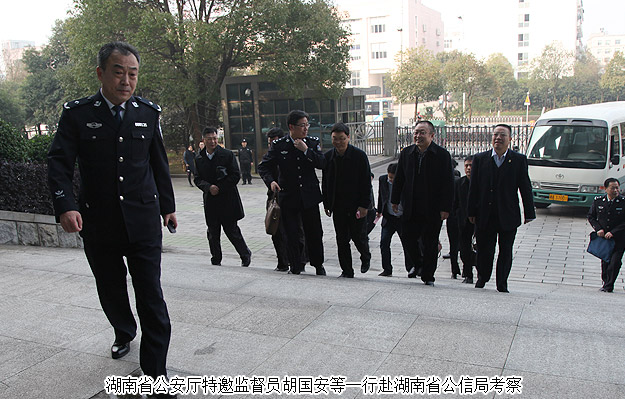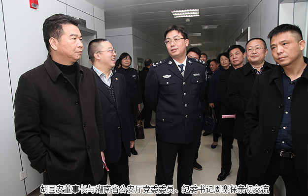 2015年12月25日下午,湖南省政协委员、省公安厅特邀监督员、mk网董事长胡国安随同湖南省公安厅党委委员、纪委书记周赛保,省公安厅副厅级干部徐发科,省公安厅纪委副书记宋红兵,省公安厅治安总队政委高洪金,省公安厅刑侦总队政委冯伟俭,省公安厅交警总队纪委书记周军,省公安厅人口与出入境管理局副局长侯占先,省公安厅警令部研究室主任胡湘文,省公安厅政治部人事处副处长文南等一行赴湖南省公民信息管理局考察。