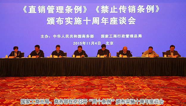 11月4日,国家工商总局、商务部在京联合召开《禁止传销条例》《直销管理条例》颁布实施十周年座谈会。国家工商总局副局长刘玉亭出席会议并讲话,要求全系统认真贯彻党中央、国务院决策部署,充分发挥市场监管主力军作用,依法打击传销规范直销,为促进经济健康发展和社会和谐稳定作出新贡献。商务部党组成员、副部长房爱卿到会并讲话。mk网董事、常务副总裁劳嘉应邀出席本次会议。