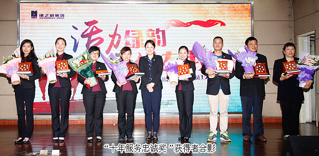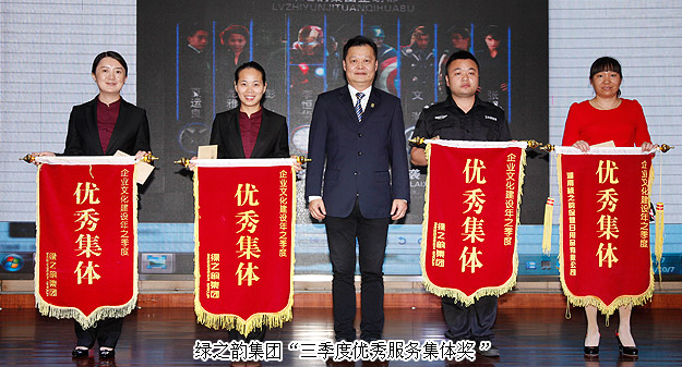 神圣的颁奖环节聚焦了全场的目光,掌声雷动,欢呼与尖叫响彻全场!丰收离不开绿之韵全体的辛勤耕耘,辉煌离不开绿之韵人的奋力拼搏。大会集中颁发了“三季度优秀服务集体”、“三季度服务明星”、“五年服务英才奖”和“十年服务忠诚奖”等奖项。获奖部门代表、个人依次踏上领奖台,享受大家的声声祝福和热烈掌声,共同分享此时此刻的快乐。本次表彰会上,业务服务部、企划部、山西分公司、保安组喜获“三季度优秀服务集体奖”,王壮、姚雅、张海丽、张智皓、程瑶、喻鸣鸾、李翼、夏丹、高芳、张晓芳、杨芳、肖波、杨丹、王小波、汤霞琳、胡树峰、齐峰雪荣获“三季度服务明星”殊荣;张晓芳、周金霖、盛夏、高素丹、彭姣、李倩婷、唐鸣、王小波、邹建华荣膺“五年服务英才奖”,董事常务副总裁劳嘉上台颁发了香港周大福珠宝公司特约设计师量身定做的、镌刻获奖者名字的足金荣誉徽章和奖金;肖巧林、蒋文、周瑛、李娟、湛甜、王薇、章建军、胡益军荣膺“十年服务忠诚奖”,不仅收获了全体绿之韵人的祝福,还按级别荣获了60万元购房补贴金、10万元企业年金奖励金、1万元的家庭带薪旅游基金和由香港周大福独家设计的金银币纪念奖章,董事常务副总裁劳嘉上台颁发了由香港周大福独家设计的金银币纪念奖章及奖金。