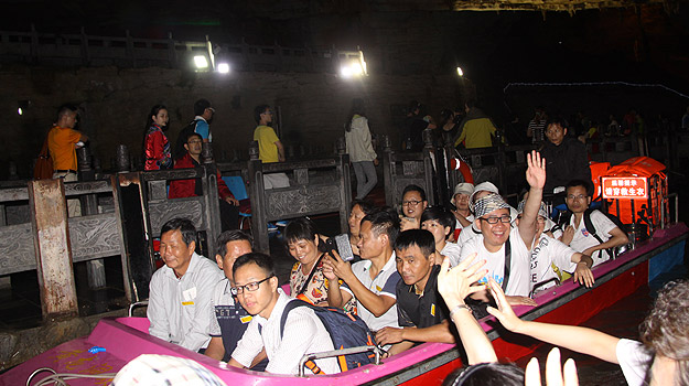 第一站家人们来到了有着“世界溶洞奇观”、“世界溶洞全能冠军”、“中国最美旅游溶洞”等美誉的黄龙洞,以其庞大的立体结构洞穴空间、丰富的溶洞景观、水陆兼备的游览观光线路独步天下。黄龙洞犹如一株株古木错节盘根、洞中有洞,洞中有河、无奇不有,真乃名副其实的“地下魔宫”,洞中还有投保一亿元的石笋定海神针、响水河、龙王聚会厅,天仙水、天柱街等著名景点。最让绿之韵家人开心和兴奋的是洞内能乘坐小船划行,一边划船一边感受无比震撼的溶洞奇观。