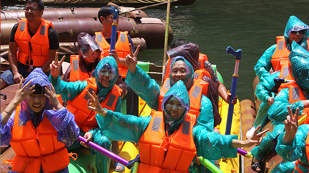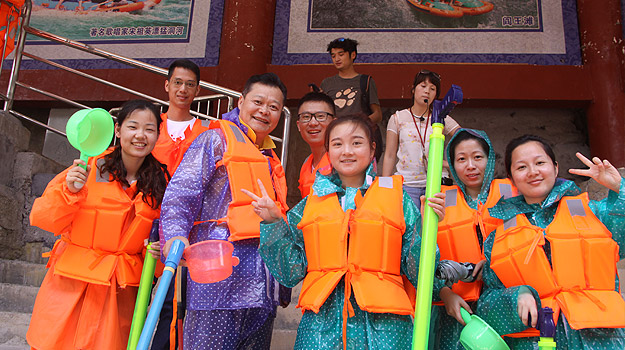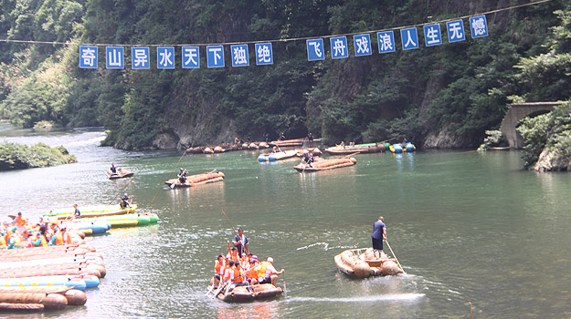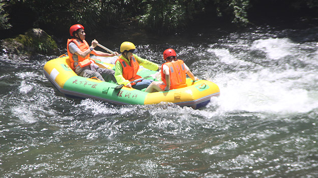 第二天上午,从“哈妮宫”出发,顺水而下,一叶扁舟,在原始次生林的高山峡谷之中,身着救身衣、乘皮舟、闯险滩、博激流、沿途观美景、沐瀑流、打水仗、过峡关,出没浪端谷底,途径三角岩、鸡笼门、落水坑瀑布、梦思峡……数十个景点,络绎而至,美不胜收。绿之韵家人在这里放歌长啸,唱起了绿之韵战歌,戏水嘻闹,找回快乐的自我。